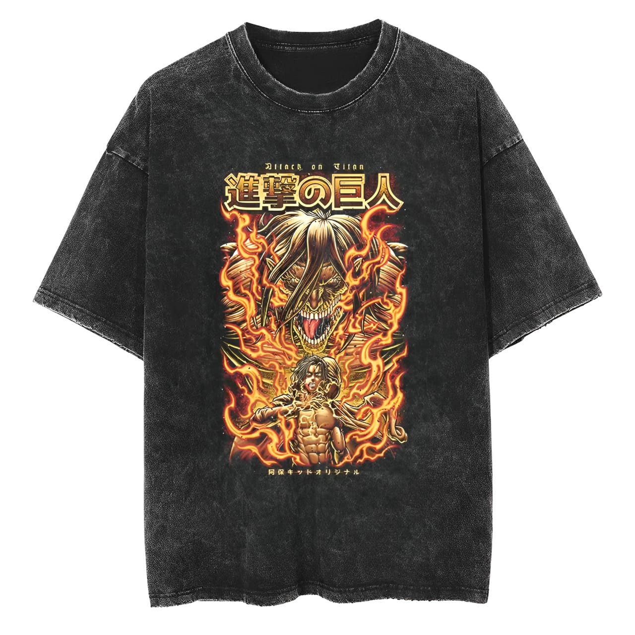 Voici un t-shirt brûlant, à l’image de la dualité d’Eren et de son titan. Entouré de flammes furieuses, le héros apparaît dans toute sa rage, prêt à tout sacrifier pour détruire ses ennemis et briser les chaînes. En arrière-plan, son titan rugit, féroce et incontrôlable, incarnant la dévastation incarnée.