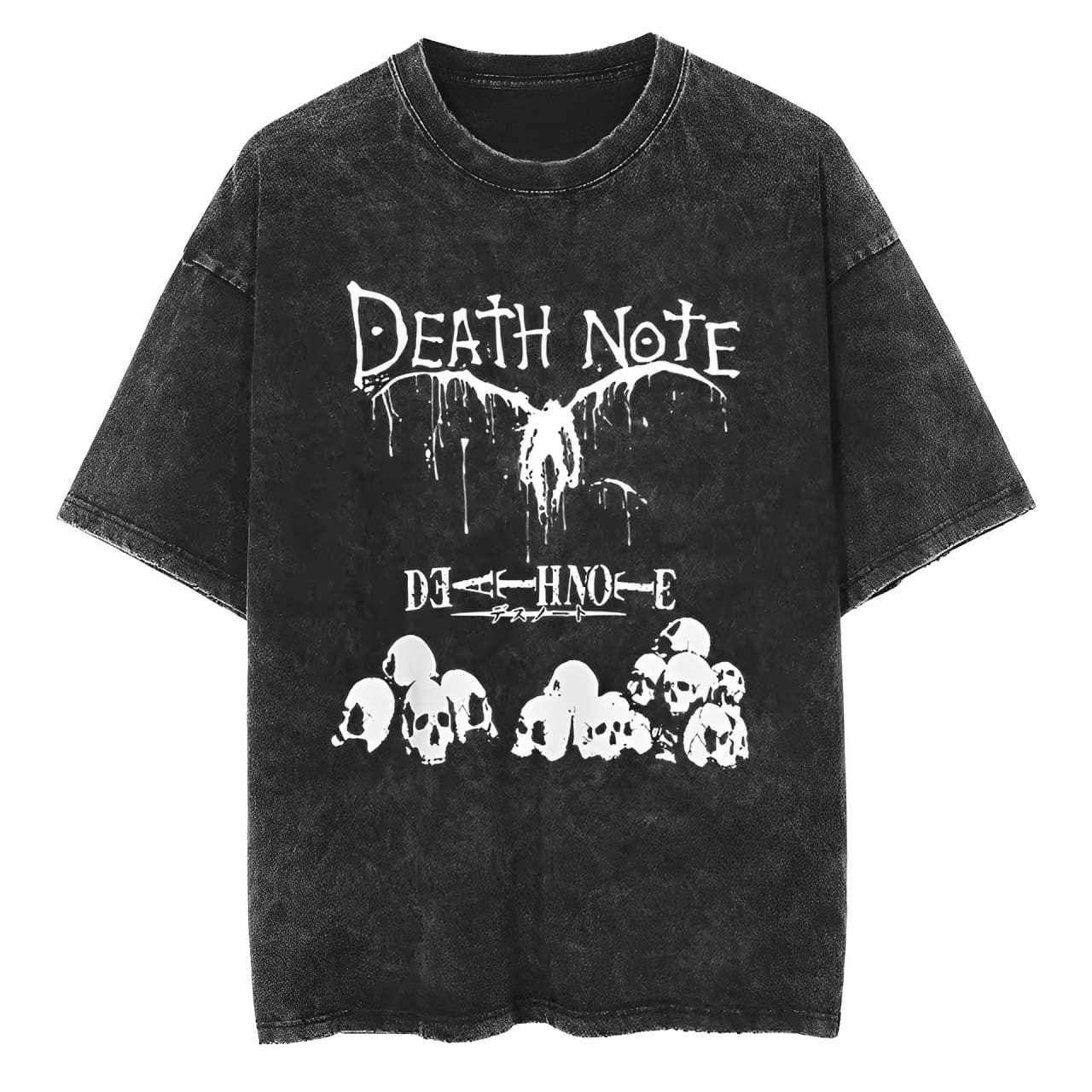 Pas de regard perçant ni de grands discours ici, juste l’ombre menaçante de Ryuk qui plane au-dessus d’un tas de crânes, dans un silence aussi lourd que son carnet. Ce t-shirt joue la carte du minimalisme macabre, avec une silhouette ailée dégoulinante en référence directe au shinigami le plus célèbre du manga.