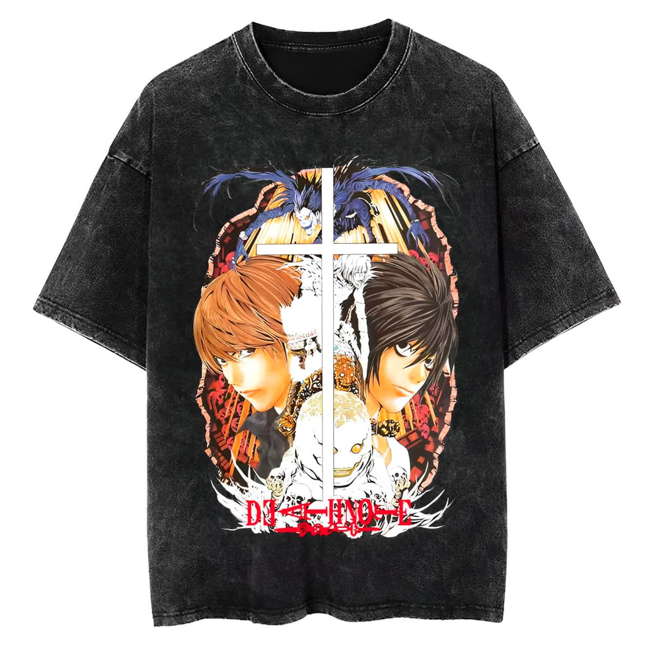Entre lumière divine et justice pervertie, ce t-shirt Death Note réunit les figures clés du combat moral le plus fascinant de l’animé. Light et L s’y font face, séparés par une croix blanche éclatante, symbole d’un duel idéologique aux accents presque sacrés. Au sommet, Ryuk plane, témoin sarcastique de cette guerre des esprits.