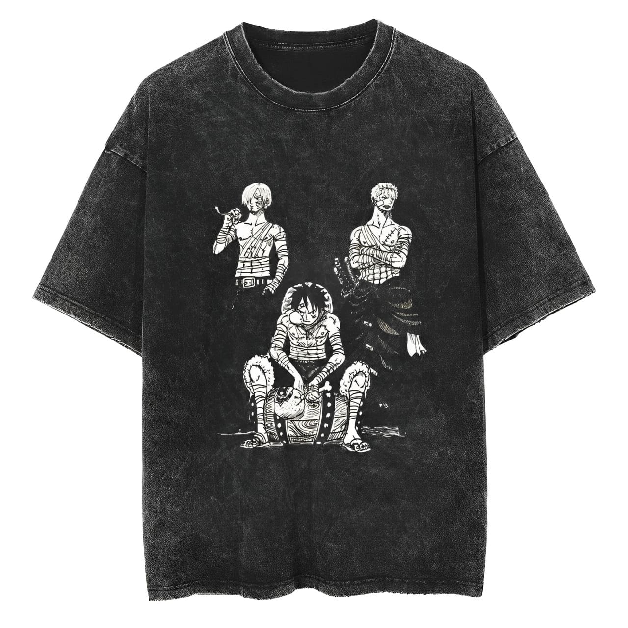 Ce t-shirt illustre un moment marquant où les héros des Mugiwaras portent encore les cicatrices de la bataille. On y retrouve Luffy assis, pansé et marqué mais toujours déterminé, accompagné de Sanji et Zoro, eux aussi couverts de bandages mais fièrement debout. Ce design capture l’esprit de One Piece : la douleur après la tempête, mais aussi la résilience et la volonté inébranlable d’avancer.